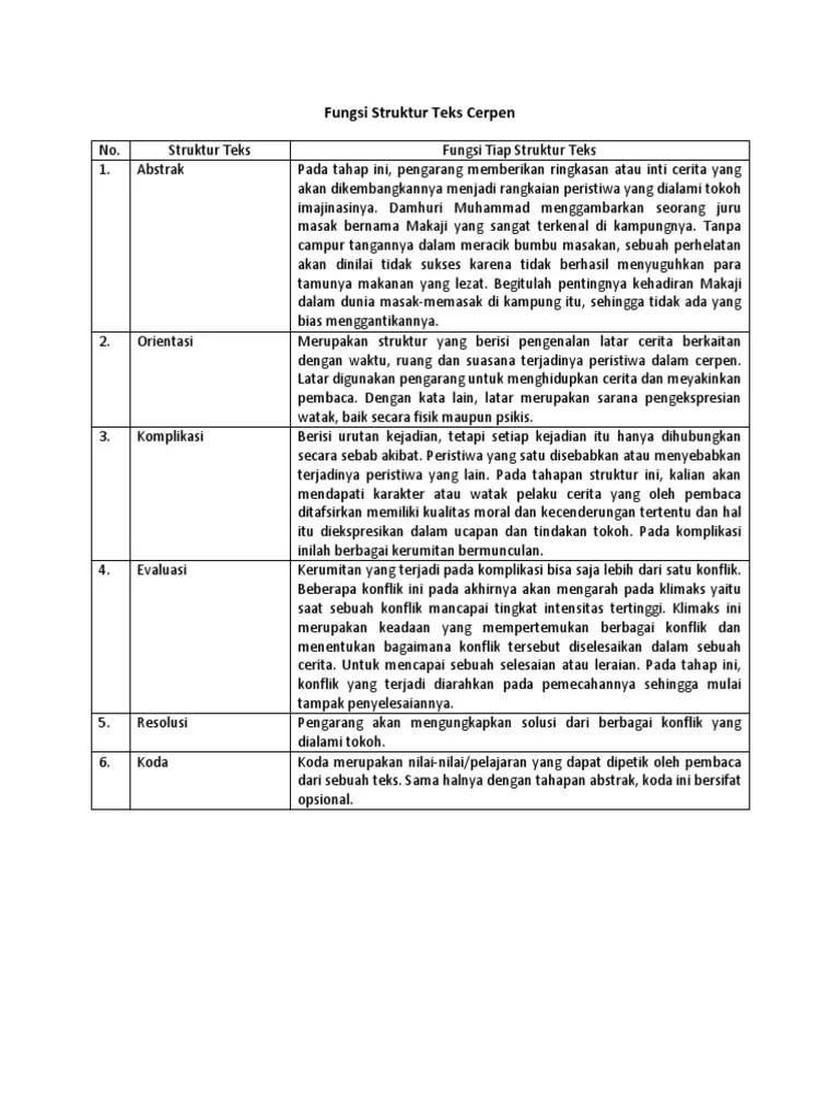 Ceritanya lebih ditujukan pada cerita pendek . Selain itu, kita juga tahu kan bila salah satu tugas mata pelajaran bahasa indonesia yang sering diberikan ialah membuat cerita pendek atau . Membuat cerpen tidak boleh sembarangan, kita harus memperhatikan struktur cerpen terlebih . Dalam sebuah cerpen terdapat 6 struktur penting yang membangun cerita pendek tersebut menjadi sebuah suatu cerita yang untuh. Kemudian, inti dari kisah yang diangkat pada cerpen hanya memuat satu permasalahan utama saja. Berikut ini adalah beberapa struktur dari cerpen: Umumnya fokus pada satu tokoh saja yang diceritakan. Berikut ini adalah beberapa bagian struktur dari cerpen, antara lain sebagai berikut ini: Yuk, lihat beberapa contoh cerpen singkat dan menarik, beserta pengertian struktur, kaidah kebahasaan, dan unsur cerpen . Kemudian marilah pelajari juga struktur cerpen juga.